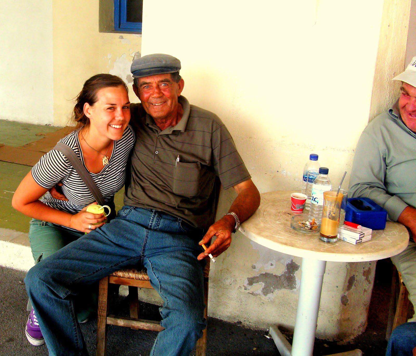 so i went to santorini and was wandering around looking for the donkeys i had heard about that you could ride up the caldera steps and saw this table of old men. they looked straight out of national geographic. i really wanted to take a picture of them... they saw me looking at them and motioned me over... i thought i probably shouldn't go and see strange men but then the desire to take the picture won out and i went anyways... turns out they were the donkey guys! i asked if i could take a picture and they thought i meant with them... so one of the others took it... this old man was kissing my cheek for a good minute before the guy would take the picture. i wish he had got him kissing me... he did capture his grabby hands...haha.
